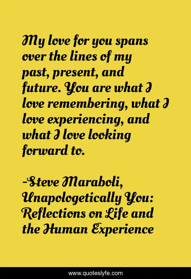 This page presents the quote "My love for you spans over the lines of my past, present, and future. You are what I love remembering, what I love experiencing, and what I love looking forward to.". Author of this quote is Steve Maraboli, Unapologetically You: Reflections on Life and the Human Experience. This quote is about relationships, true-love, life, love, past, future, present, happiness, affection,.