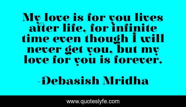 This page presents the quote "My love is for you lives after life, for infinite time even though I will never get you, but my love for you is forever.". Author of this quote is Debasish Mridha. This quote is about life, love, knowledge, inspirational, intelligence, philosophy, wisdom, quotes, affection,.