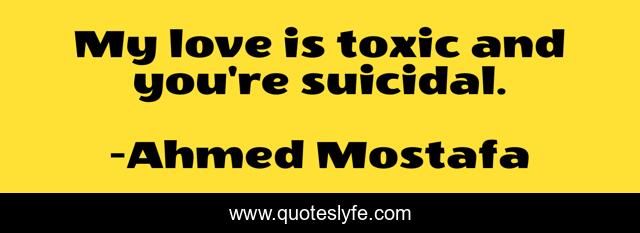 This page presents the quote "My love is toxic and you're suicidal.". Author of this quote is Ahmed Mostafa. This quote is about suicidal, toxic-relationships, toxic-people, toxic, love, affection, masochism,.