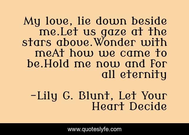 This page presents the quote "My love, lie down beside me.Let us gaze at the stars above.Wonder with meAt how we came to be.Hold me now and for all eternity". Author of this quote is Lily G. Blunt, Let Your Heart Decide. This quote is about eternity, love, stars, affection,.