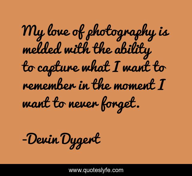 This page presents the quote "My love of photography is melded with the ability to capture what I want to remember in the moment I want to never forget.". Author of this quote is Devin Dygert. .