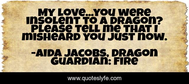 This page presents the quote "My love...you were insolent to a dragon? Please tell me that I misheard you just now.". Author of this quote is Aida Jacobs, Dragon Guardian: Fire. This quote is about talisen-roseleaf, fantasy-series, fantasy-books, dragon, fantasy, dragons, aida-jacobs, dragon-guardian-fire,.