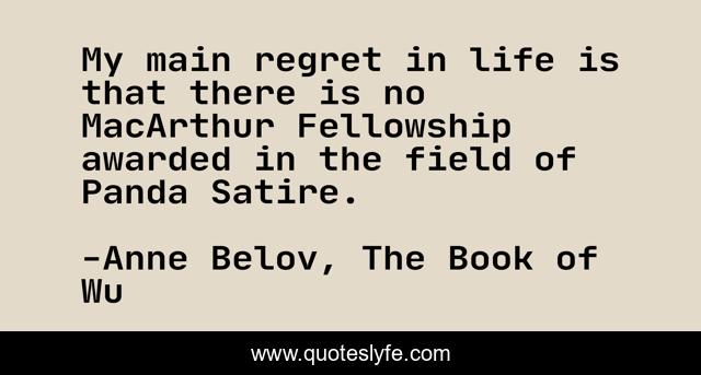 This page presents the quote "My main regret in life is that there is no MacArthur Fellowship awarded in the field of Panda Satire.". Author of this quote is Anne Belov, The Book of Wu. This quote is about humor, comics, quirkys, satire, cats, talking-animal, pandas, graphic-novels,.