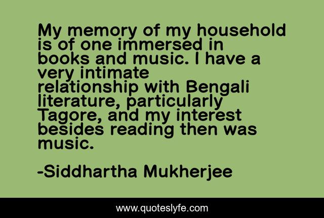 This page presents the quote "My memory of my household is of one immersed in books and music. I have a very intimate relationship with Bengali literature, particularly Tagore, and my interest besides reading then was music.". Author of this quote is Siddhartha Mukherjee. This quote is about reading, music, memory,.