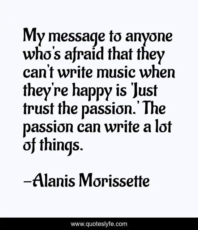 This page presents the quote "My message to anyone who's afraid that they can't write music when they're happy is 'Just trust the passion.' The passion can write a lot of things.". Author of this quote is Alanis Morissette. This quote is about music, passion, happy,.