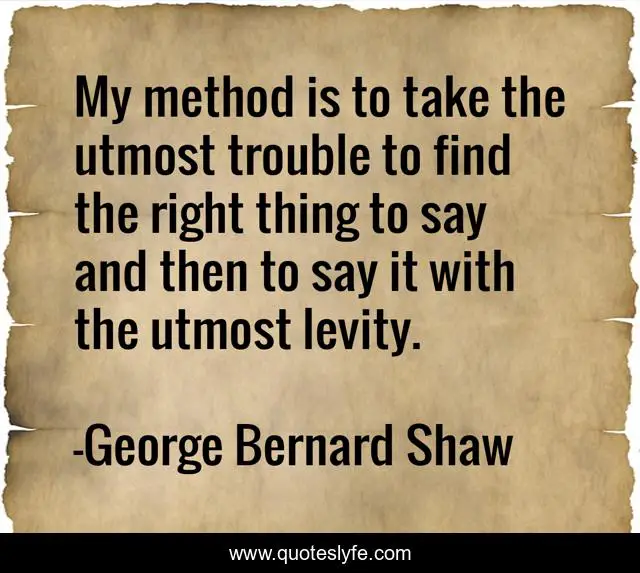 This page presents the quote "My method is to take the utmost trouble to find the right thing to say and then to say it with the utmost levity.". Author of this quote is George Bernard Shaw. This quote is about writers, writing,.