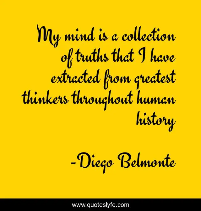 This page presents the quote "My mind is a collection of truths that I have extracted from greatest thinkers throughout human history". Author of this quote is Diego Belmonte. This quote is about mind, knowledge, smart,.