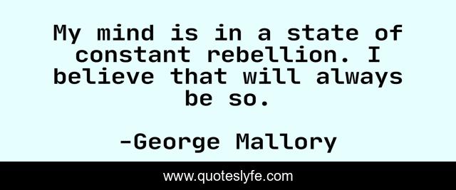 This page presents the quote "My mind is in a state of constant rebellion. I believe that will always be so.". Author of this quote is George Mallory. This quote is about history, everest, mountaineering,.
