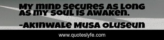 This page presents the quote "My mind secures as long as my soul is awaken.". Author of this quote is Akinwale Musa Oluseun. This quote is about enthusiasm, mind, soul, inspirational,.