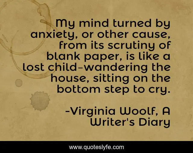 This page presents the quote "My mind turned by anxiety, or other cause, from its scrutiny of blank paper, is like a lost child–wandering the house, sitting on the bottom step to cry.". Author of this quote is Virginia Woolf, A Writer's Diary. This quote is about anxiety, writing,.