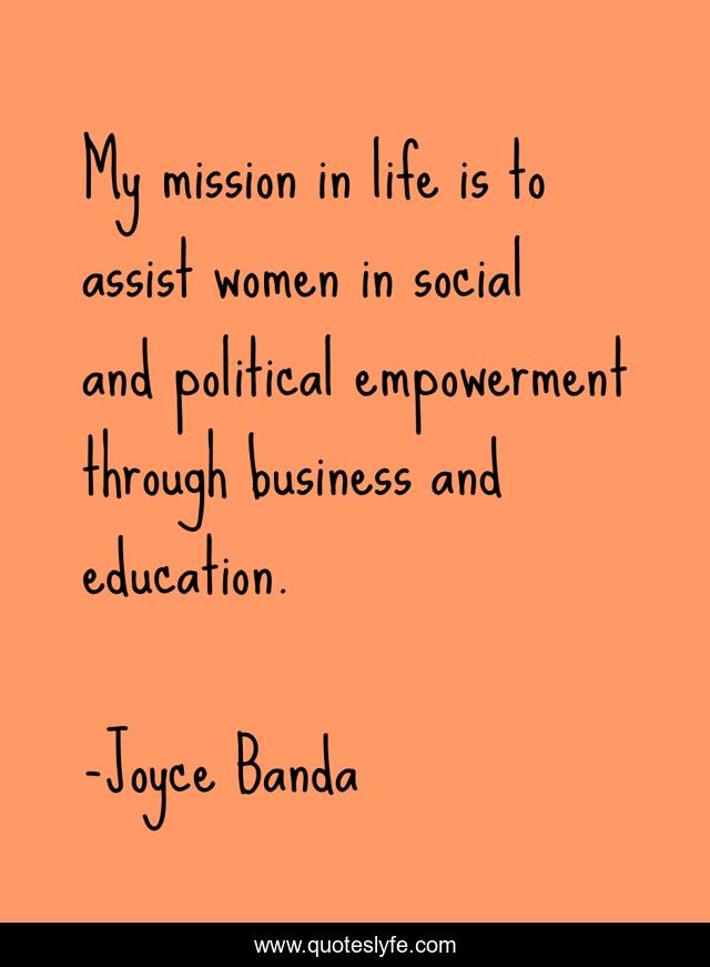 This page presents the quote "My mission in life is to assist women in social and political empowerment through business and education.". Author of this quote is Joyce Banda. This quote is about life, business, women,.