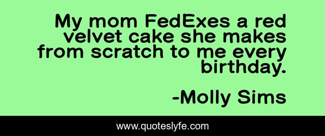 This page presents the quote "My mom FedExes a red velvet cake she makes from scratch to me every birthday.". Author of this quote is Molly Sims. This quote is about me, mom, red,.