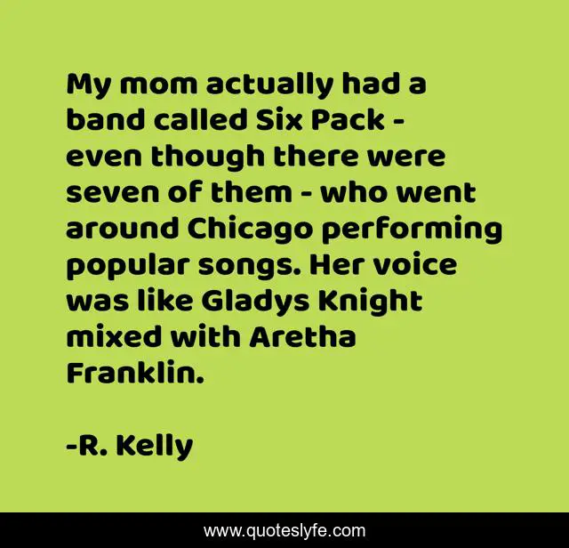 This page presents the quote "My mom actually had a band called Six Pack - even though there were seven of them - who went around Chicago performing popular songs. Her voice was like Gladys Knight mixed with Aretha Franklin.". Author of this quote is R. Kelly. This quote is about voice, her, chicago,.