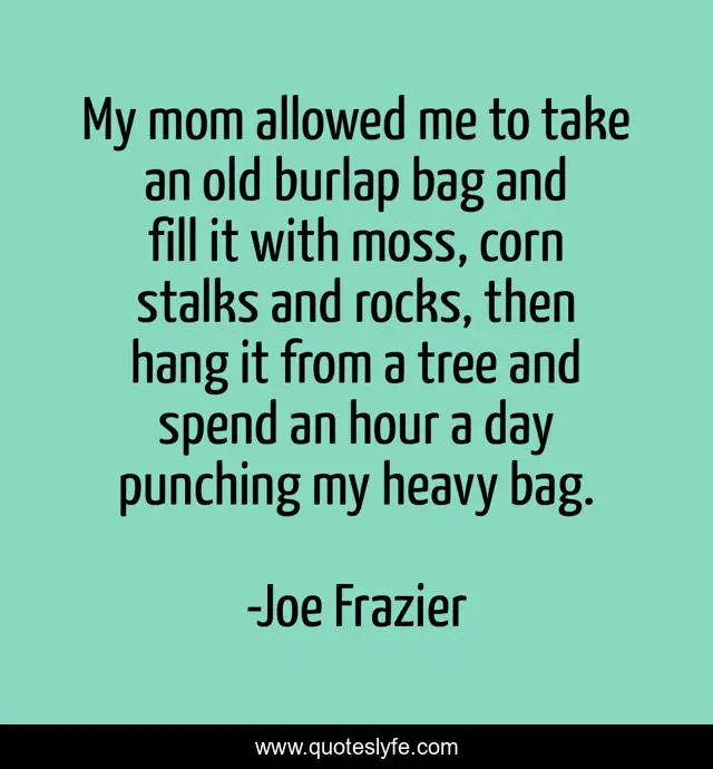This page presents the quote "My mom allowed me to take an old burlap bag and fill it with moss, corn stalks and rocks, then hang it from a tree and spend an hour a day punching my heavy bag.". Author of this quote is Joe Frazier. This quote is about me, tree, day,.