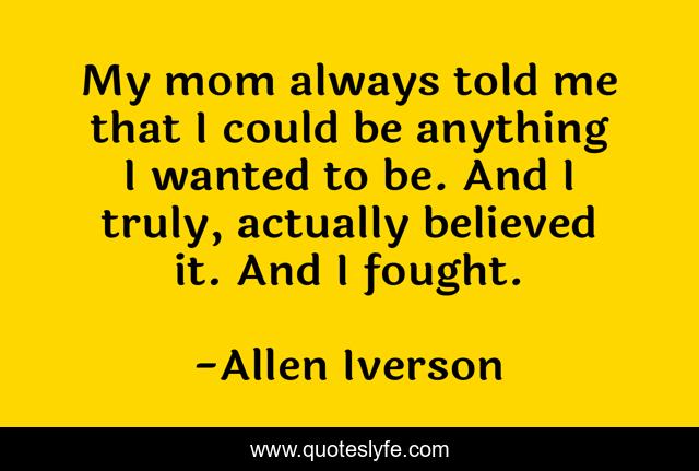 This page presents the quote "My mom always told me that I could be anything I wanted to be. And I truly, actually believed it. And I fought.". Author of this quote is Allen Iverson. This quote is about me, always, anything,.
