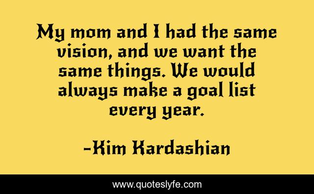 This page presents the quote "My mom and I had the same vision, and we want the same things. We would always make a goal list every year.". Author of this quote is Kim Kardashian. This quote is about goal, vision,.