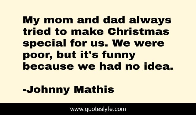 This page presents the quote "My mom and dad always tried to make Christmas special for us. We were poor, but it's funny because we had no idea.". Author of this quote is Johnny Mathis. This quote is about funny, comedy, mom, special,.