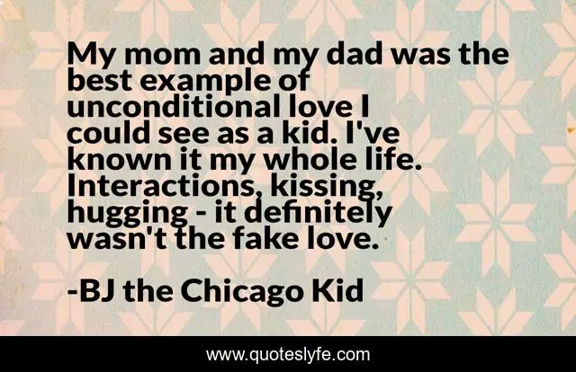 This page presents the quote "My mom and my dad was the best example of unconditional love I could see as a kid. I've known it my whole life. Interactions, kissing, hugging - it definitely wasn't the fake love.". Author of this quote is BJ the Chicago Kid. This quote is about life, love, best, affection,.