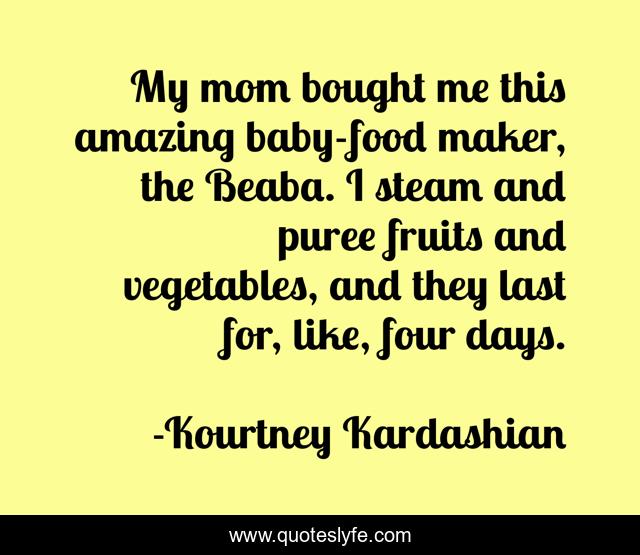 This page presents the quote "My mom bought me this amazing baby-food maker, the Beaba. I steam and puree fruits and vegetables, and they last for, like, four days.". Author of this quote is Kourtney Kardashian. This quote is about me, vegetables, mom,.