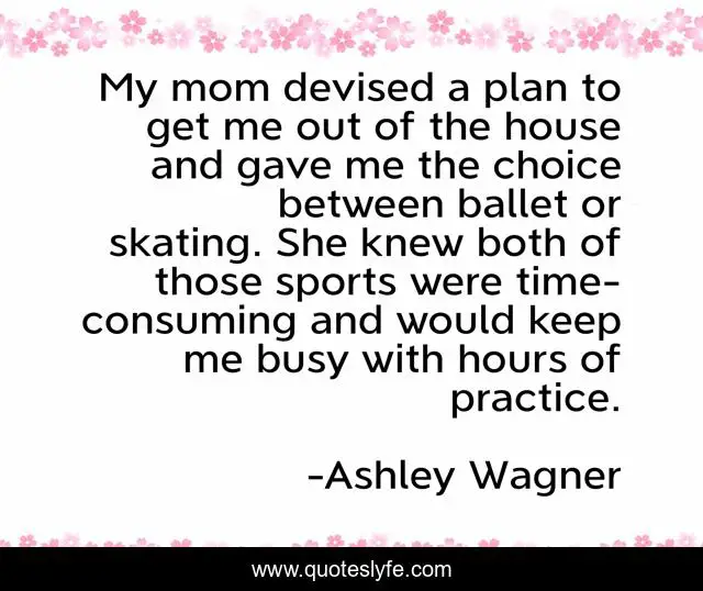 This page presents the quote "My mom devised a plan to get me out of the house and gave me the choice between ballet or skating. She knew both of those sports were time-consuming and would keep me busy with hours of practice.". Author of this quote is Ashley Wagner. This quote is about busy, mom, choice,.