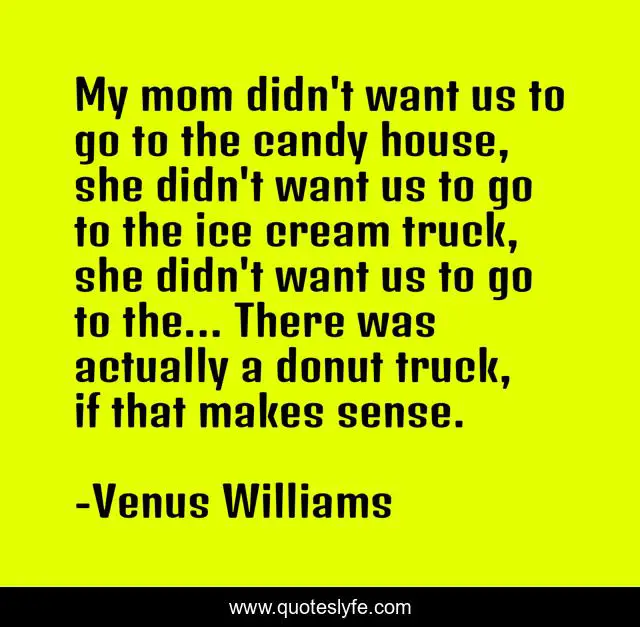 This page presents the quote "My mom didn't want us to go to the candy house, she didn't want us to go to the ice cream truck, she didn't want us to go to the... There was actually a donut truck, if that makes sense.". Author of this quote is Venus Williams. This quote is about ice cream, candy,.