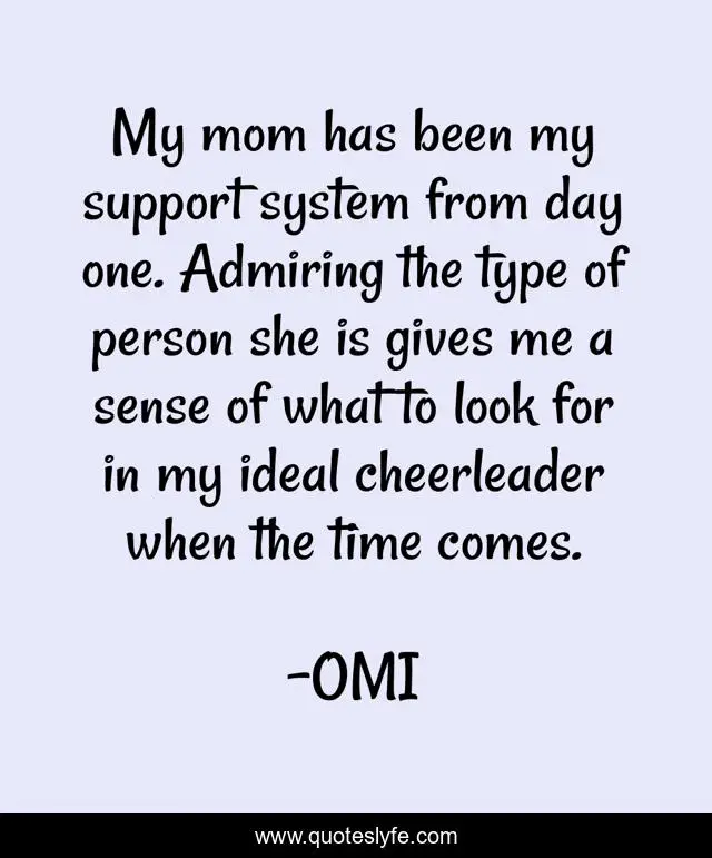 This page presents the quote "My mom has been my support system from day one. Admiring the type of person she is gives me a sense of what to look for in my ideal cheerleader when the time comes.". Author of this quote is OMI. This quote is about support, day, time,.