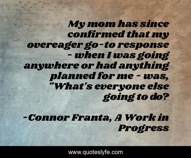 This page presents the quote "My mom has since confirmed that my overeager go-to response - when I was going anywhere or had anything planned for me - was, "What's everyone else going to do?". Author of this quote is Connor Franta, A Work in Progress. .