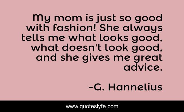 This page presents the quote "My mom is just so good with fashion! She always tells me what looks good, what doesn't look good, and she gives me great advice.". Author of this quote is G. Hannelius. This quote is about me, great, good,.