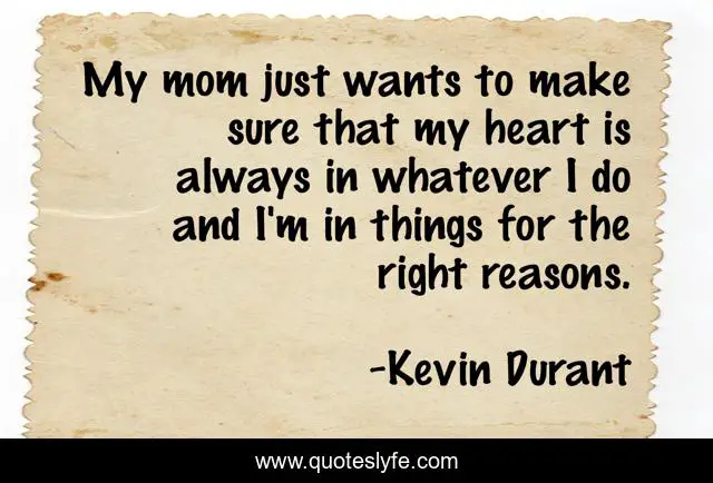 This page presents the quote "My mom just wants to make sure that my heart is always in whatever I do and I'm in things for the right reasons.". Author of this quote is Kevin Durant. This quote is about heart, right, always,.