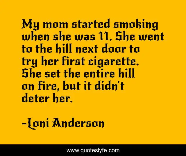 This page presents the quote "My mom started smoking when she was 11. She went to the hill next door to try her first cigarette. She set the entire hill on fire, but it didn't deter her.". Author of this quote is Loni Anderson. This quote is about fire, smoking, door,.