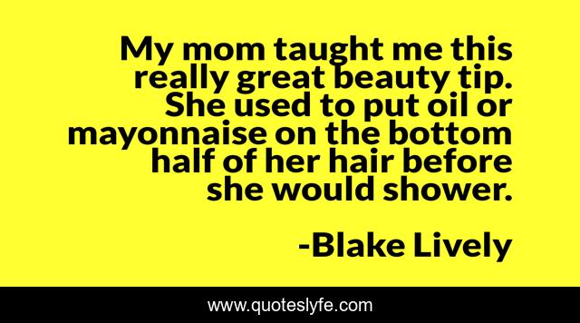 This page presents the quote "My mom taught me this really great beauty tip. She used to put oil or mayonnaise on the bottom half of her hair before she would shower.". Author of this quote is Blake Lively. This quote is about hair, great, beauty,.