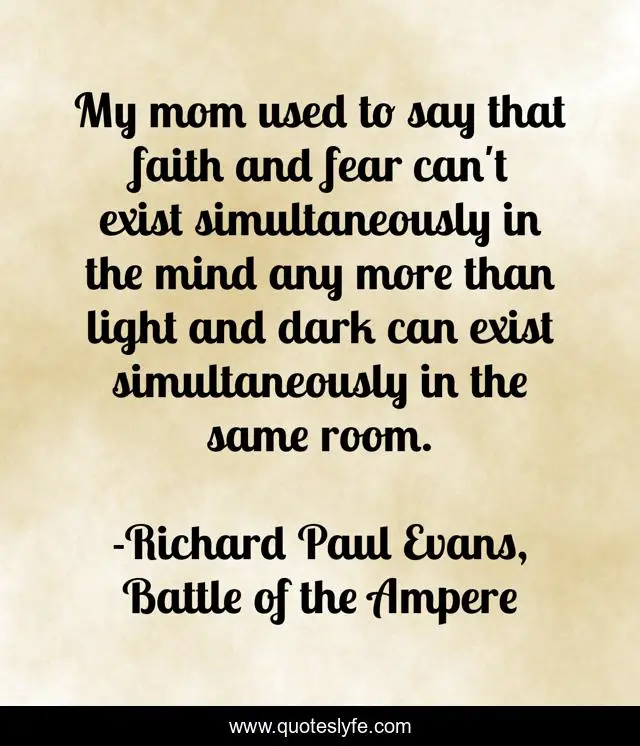 This page presents the quote "My mom used to say that faith and fear can't exist simultaneously in the mind any more than light and dark can exist simultaneously in the same room.". Author of this quote is Richard Paul Evans, Battle of the Ampere. This quote is about dark, faith, fear, light,.
