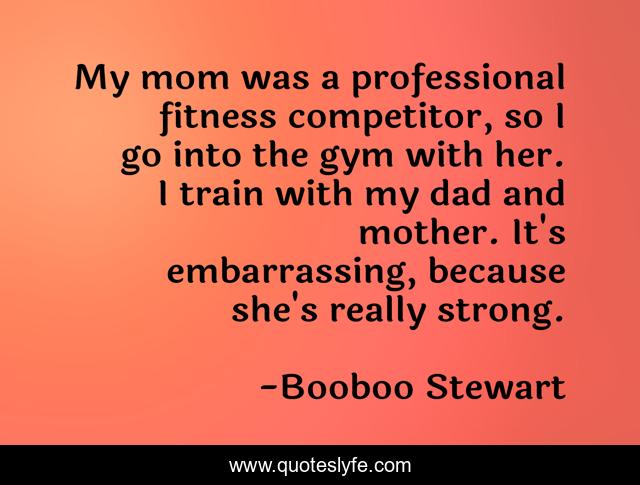 This page presents the quote "My mom was a professional fitness competitor, so I go into the gym with her. I train with my dad and mother. It's embarrassing, because she's really strong.". Author of this quote is Booboo Stewart. This quote is about strong, mom, mother,.
