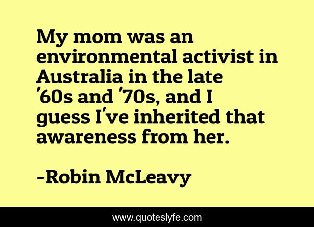 This page presents the quote "My mom was an environmental activist in Australia in the late '60s and '70s, and I guess I've inherited that awareness from her.". Author of this quote is Robin McLeavy. This quote is about late, mom, her,.