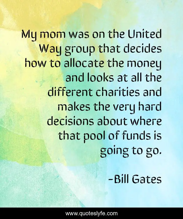 This page presents the quote "My mom was on the United Way group that decides how to allocate the money and looks at all the different charities and makes the very hard decisions about where that pool of funds is going to go.". Author of this quote is Bill Gates. This quote is about money, decisions, group,.