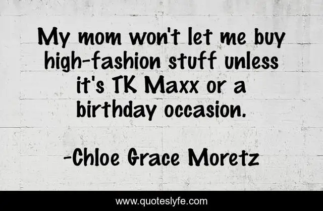 This page presents the quote "My mom won't let me buy high-fashion stuff unless it's TK Maxx or a birthday occasion.". Author of this quote is Chloe Grace Moretz. This quote is about me, buy, mom,.