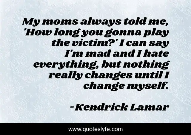 This page presents the quote "My moms always told me, 'How long you gonna play the victim?' I can say I'm mad and I hate everything, but nothing really changes until I change myself.". Author of this quote is Kendrick Lamar. This quote is about changes, myself, hate,.