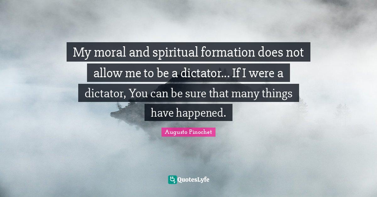 This page presents the quote "My moral and spiritual formation does not allow me to be a dictator... If I were a dictator, You can be sure that many things have happened.". Author of this quote is Augusto Pinochet. This quote is about spiritual formation, spiritual, moral, dictator, doe, happened,.