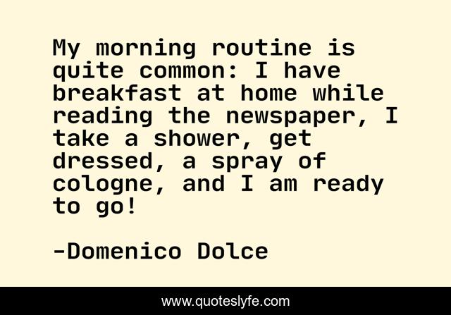This page presents the quote "My morning routine is quite common: I have breakfast at home while reading the newspaper, I take a shower, get dressed, a spray of cologne, and I am ready to go!". Author of this quote is Domenico Dolce. This quote is about home, reading,.