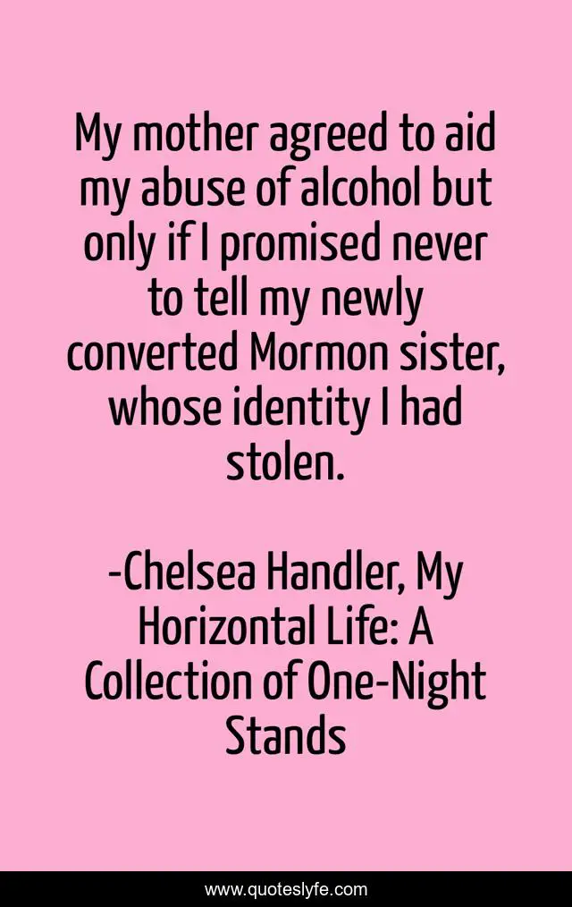 This page presents the quote "My mother agreed to aid my abuse of alcohol but only if I promised never to tell my newly converted Mormon sister, whose identity I had stolen.". Author of this quote is Chelsea Handler, My Horizontal Life: A Collection of One-Night Stands. This quote is about humor, identity-theft, alcohol, family,.