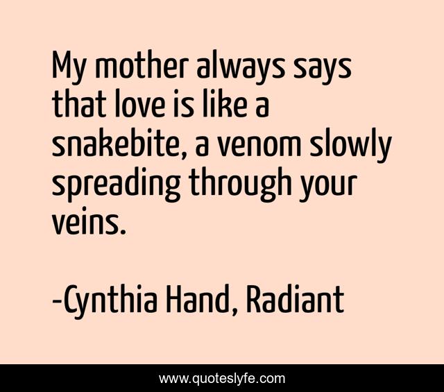 This page presents the quote "My mother always says that love is like a snakebite, a venom slowly spreading through your veins.". Author of this quote is Cynthia Hand, Radiant. This quote is about metaphor, beautiful-imagery,.