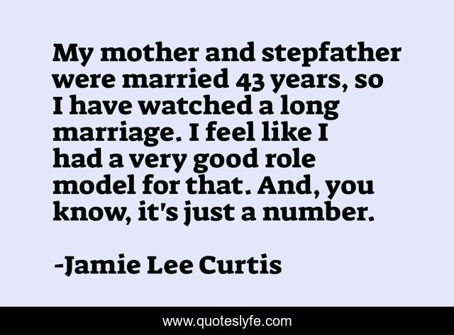 This page presents the quote "My mother and stepfather were married 43 years, so I have watched a long marriage. I feel like I had a very good role model for that. And, you know, it's just a number.". Author of this quote is Jamie Lee Curtis. This quote is about good, marriage, mother,.