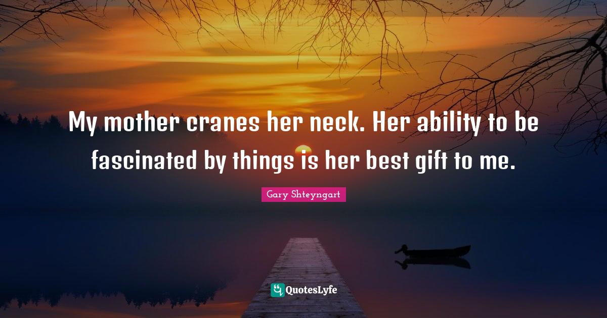 This page presents the quote "My mother cranes her neck. Her ability to be fascinated by things is her best gift to me.". Author of this quote is Gary Shteyngart. This quote is about best gift, cranes, fascinated, mother, ability, necks,.