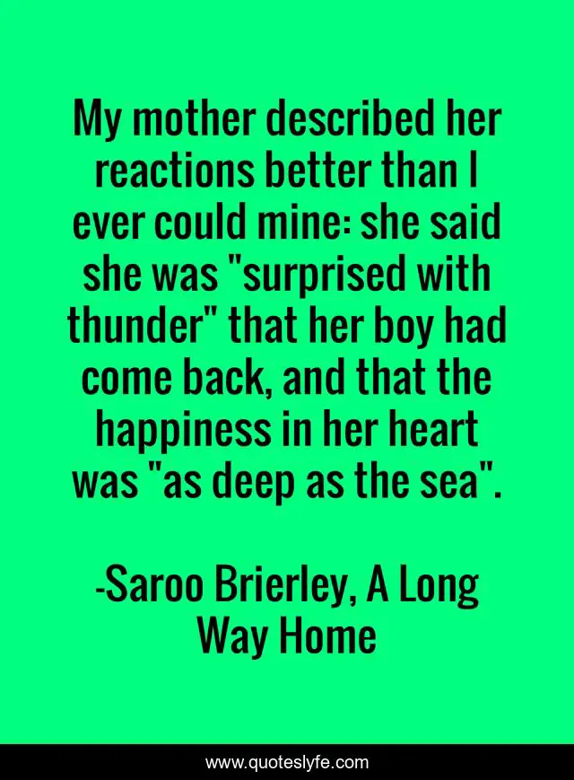 This page presents the quote "My mother described her reactions better than I ever could mine: she said she was "surprised with thunder" that her boy had come back, and that the happiness in her heart was "as deep as the sea".". Author of this quote is Saroo Brierley, A Long Way Home. This quote is about sons, happiness, reunions, mothers,.
