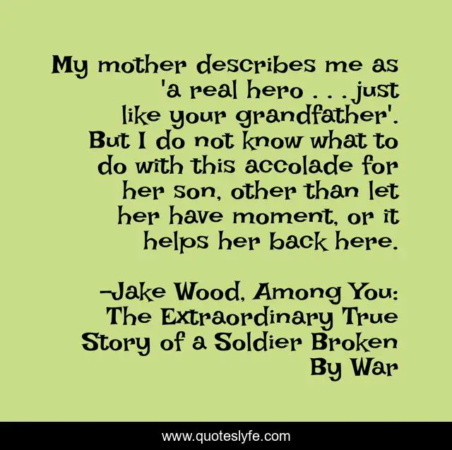 This page presents the quote "My mother describes me as 'a real hero . . . just like your grandfather'. But I do not know what to do with this accolade for her son, other than let her have moment, or it helps her back here.". Author of this quote is Jake Wood, Among You: The Extraordinary True Story of a Soldier Broken By War. This quote is about soldier, war-hero, hero, military-ptsd, combat-ptsd,.