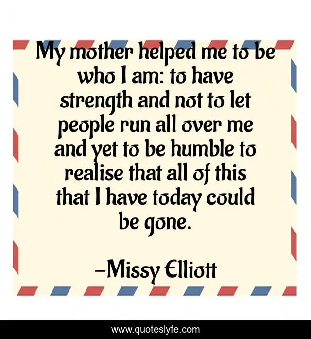 This page presents the quote "My mother helped me to be who I am: to have strength and not to let people run all over me and yet to be humble to realise that all of this that I have today could be gone.". Author of this quote is Missy Elliott. This quote is about today, mother,.