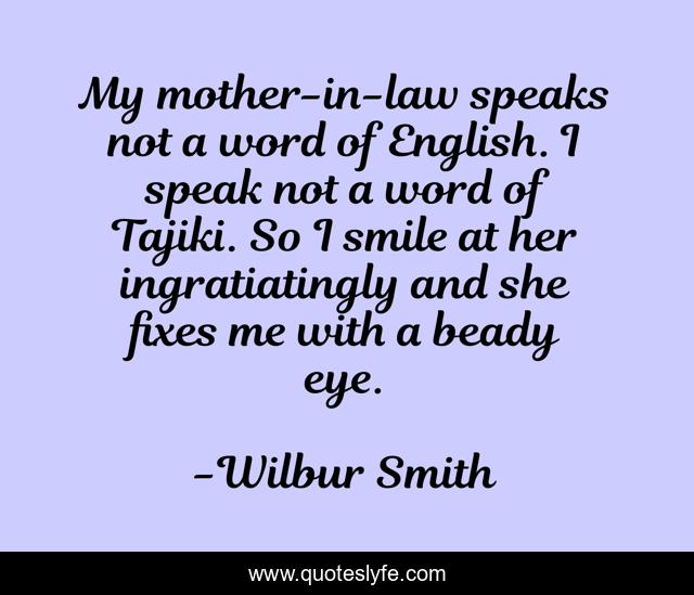 This page presents the quote "My mother-in-law speaks not a word of English. I speak not a word of Tajiki. So I smile at her ingratiatingly and she fixes me with a beady eye.". Author of this quote is Wilbur Smith. This quote is about me, eye, speak,.