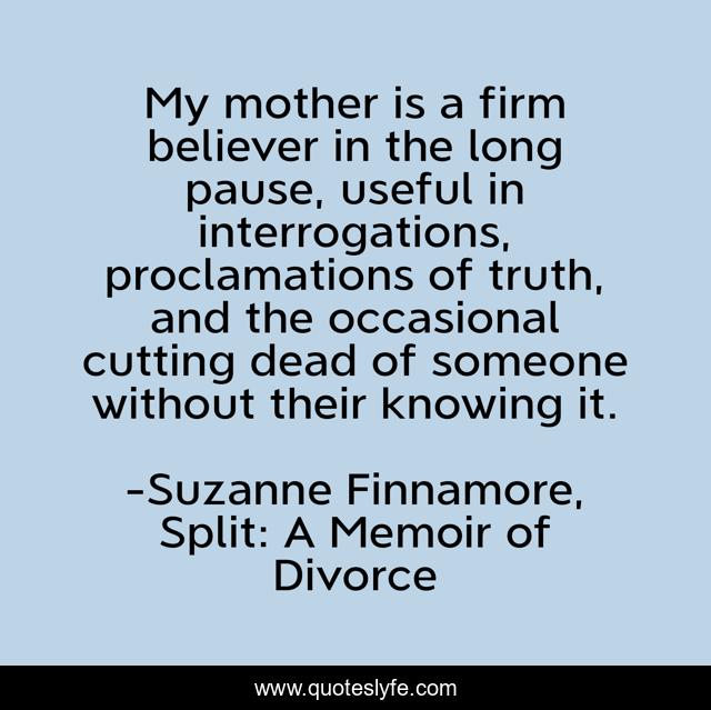 This page presents the quote "My mother is a firm believer in the long pause, useful in interrogations, proclamations of truth, and the occasional cutting dead of someone without their knowing it.". Author of this quote is Suzanne Finnamore, Split: A Memoir of Divorce. This quote is about deceit, divorce, interrogations, truth, infidelity,.