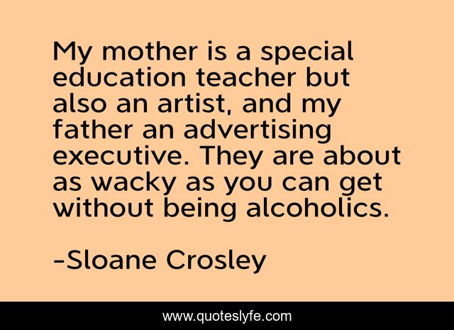 This page presents the quote "My mother is a special education teacher but also an artist, and my father an advertising executive. They are about as wacky as you can get without being alcoholics.". Author of this quote is Sloane Crosley. This quote is about education, father, mother,.