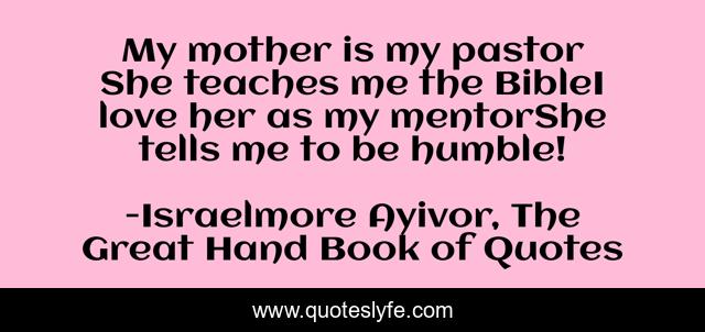 This page presents the quote "My mother is my pastor She teaches me the BibleI love her as my mentorShe tells me to be humble!". Author of this quote is Israelmore Ayivor, The Great Hand Book of Quotes. This quote is about food-for-thought, bible, love, mothers-day, humble, pastor, i-love-mum, mama, happy-mothers-day,.
